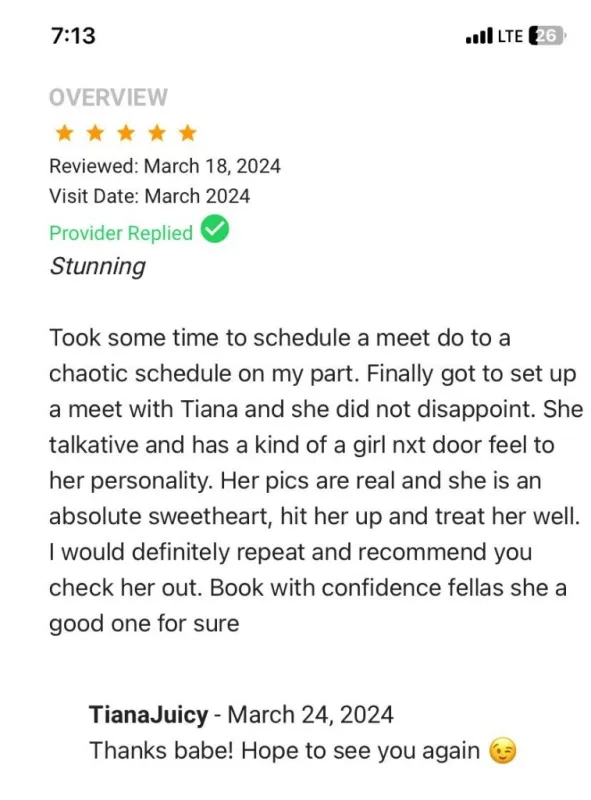 π PLEASE READ ENTIRE AD BEFORE CONTACTING ME π Hey guys I'm Tiana, Let's have some fun! My beautiful face, soft skin, alluring bedroom eyes, 34DDs and soft booty will have you mesmerized! I am all Natural and have a bubbly, down to earth personality. πΊ I am a 100% REAL provider, verified & well reviewed on PrivateDelights. π·I also provide Facetime Sessions, & have lots of sexy content available! β£ Safety is my top priority, & should be yours too. With that being said, I DO NOT provide GFE, Greek, or BB services of ANY kind. PLEASE respect that & do not ask. π If you would like to meet, please TEXT me first with your name, age, race, desired time of meeting, & how much time you would like to spend with me. π Light Screnning Required No Execptions. π I am drama free, and I expect the same from you. Kind, RESPECTFUL gentlemen only please. Rude, or explicit messages will be ignored. Donations are for my time & companionsip.