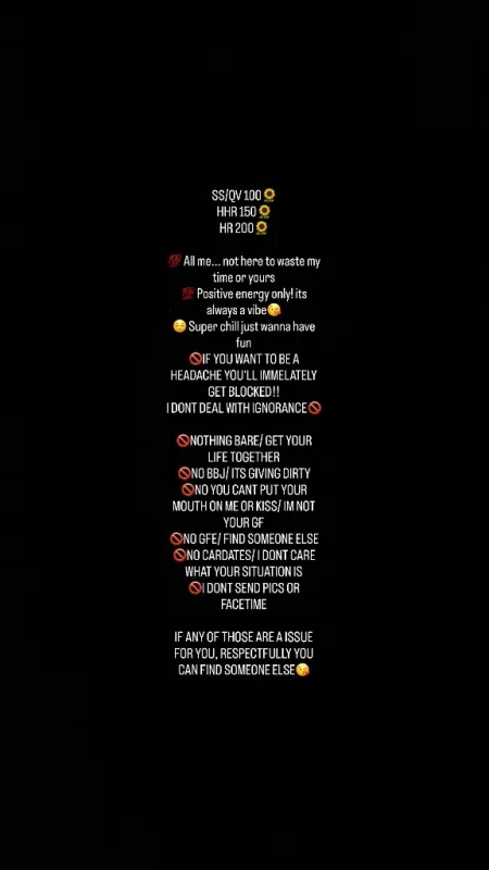SS 100π» HHR 150π» HR 200π» π― All me... not here to waste my time or yours π― Positive energy only! its always a vibeπ π Super chill just wanna have fun π«IF YOU WANT TO BE A HEADACHE YOU'LL IMMELATELY GET BLOCKEDβΌ I DONT DEAL WITH IGNORANCEπ« π«NOTHING BARE/ GET YOUR LIFE TOGETHER π«NO BBJ/ ITS GIVING DIRTY π« NO BACKDOOR PLAY π«NO YOU CANT PUT YOUR MOUTH ON ME OR KISS/ IM NOT YOUR GF π«NO GFE/ FIND SOMEONE ELSE π«NO CARDATES/ I DONT CARE WHAT YOUR SITUATION IS π«I DONT SEND PICS OR FACETIME IF ANY OF THOSE ARE A ISSUE FOR YOU, RESPECTFULLY YOU CAN FIND SOMEONE ELSEπ